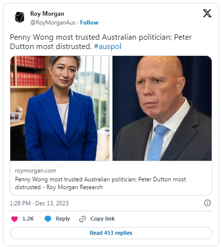 總理阿爾巴尼斯去年在最受信任榜單上位列第二,今年卻成為排名第三的最不受信任的政界人士。